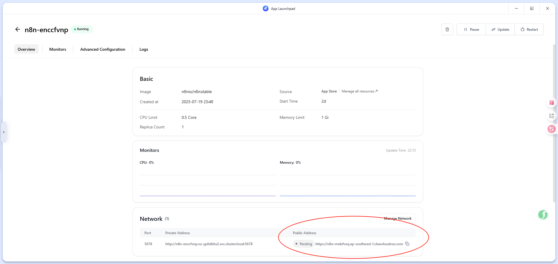 部署完成,打开App Lanchpad,点击n8n实例,等一段时间后,如图示public Address方可生效供浏览器访问。