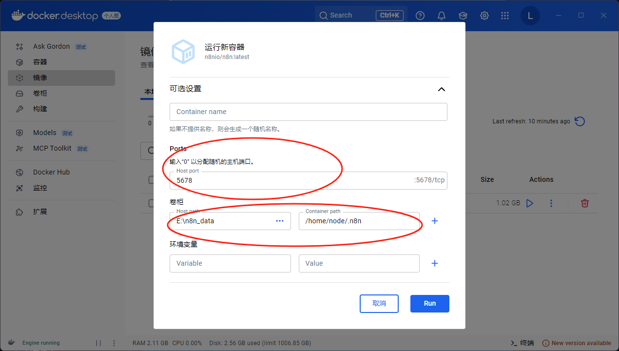 首次运行时,Docker Desktop 会进入 Container(容器)创建界面。有两个部分需要修改: