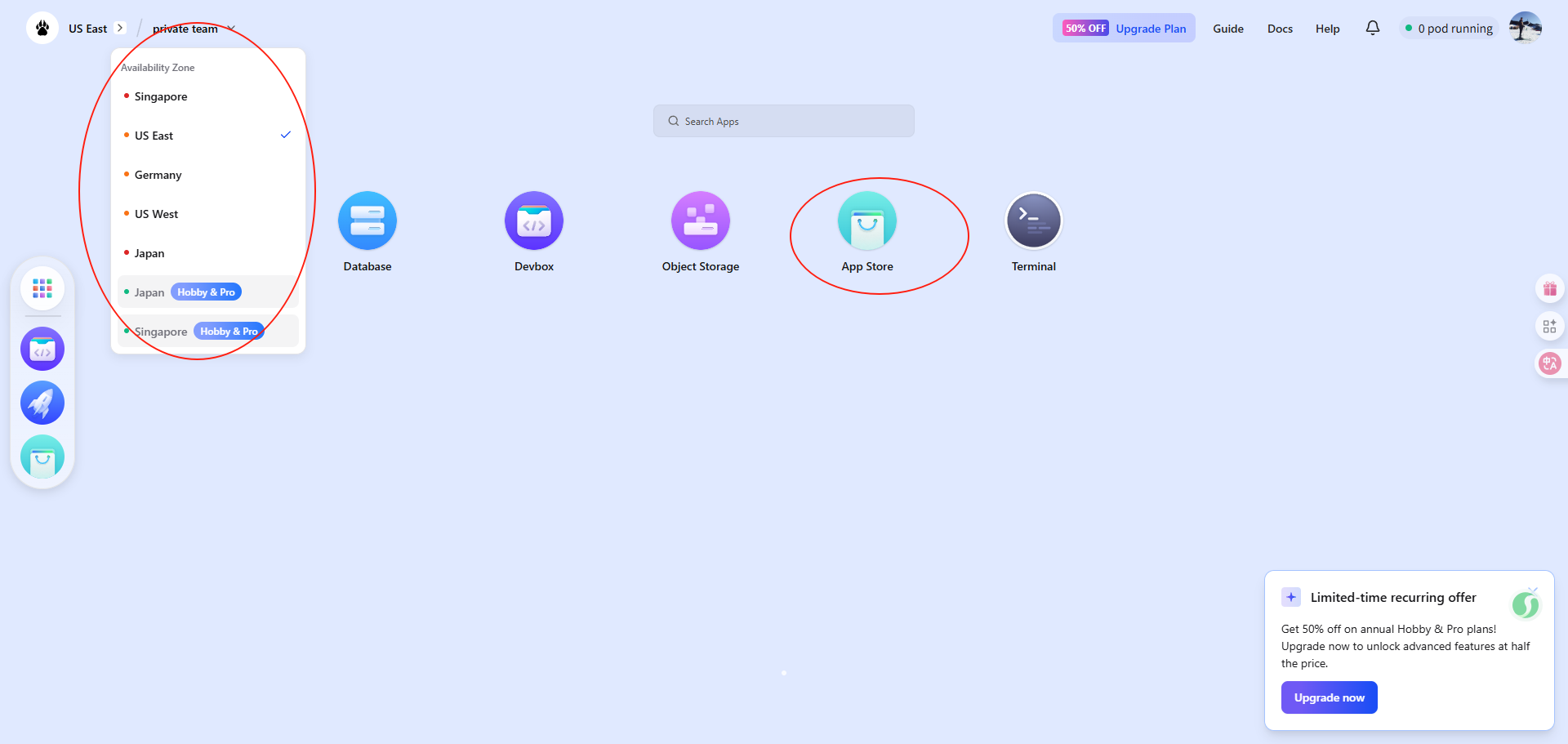 第二步:选择一个部署区域,在app store中搜索n8n并安装