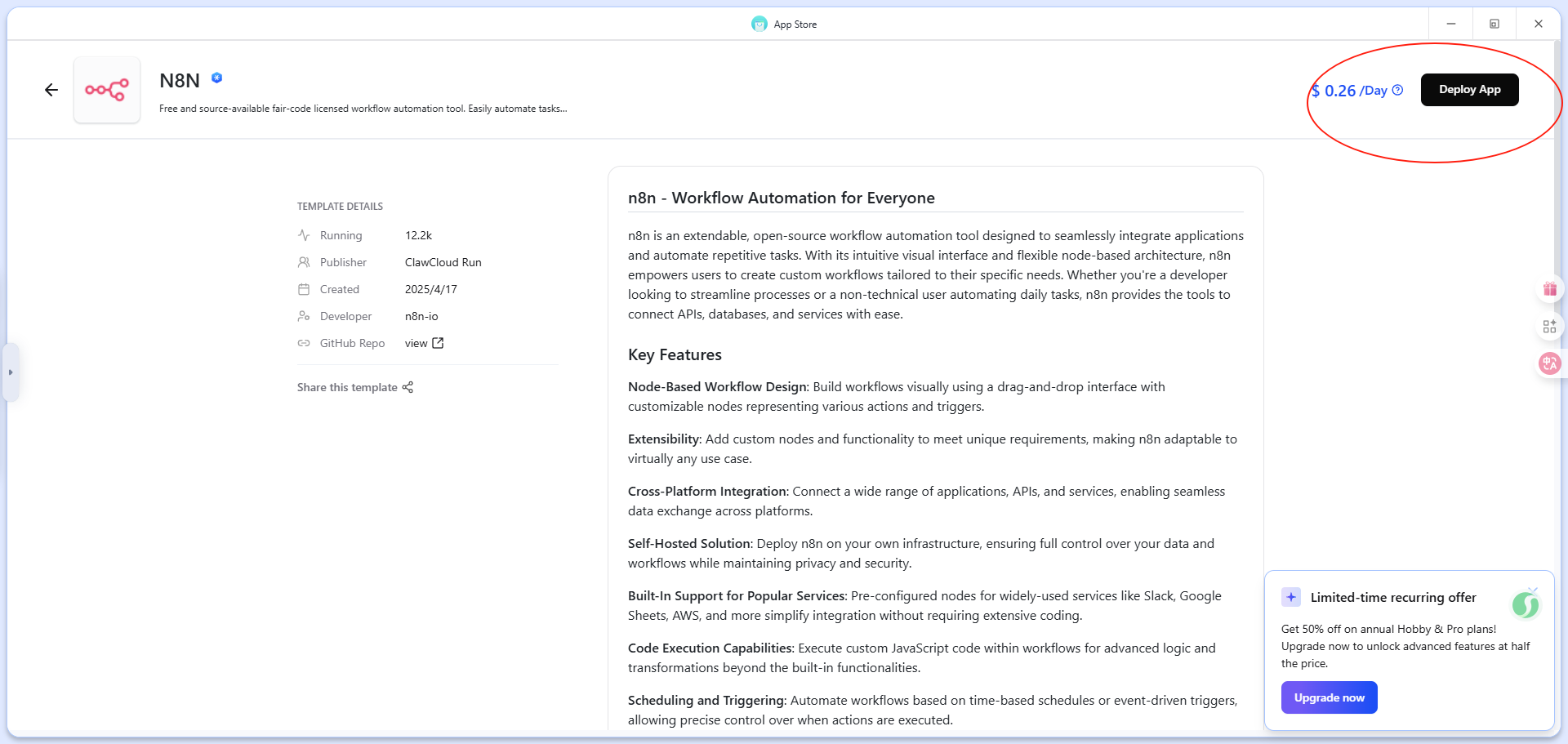 鉴于服务器需要采购费用,这里推荐一款clawcloudrun的云服务器,当前有政策优惠,对于使用已经注册过180天的github账号登录,会每月赠送5美金的额度,对于部署n8n,只要合理控制资源,就可以做到白嫖此服务器。
