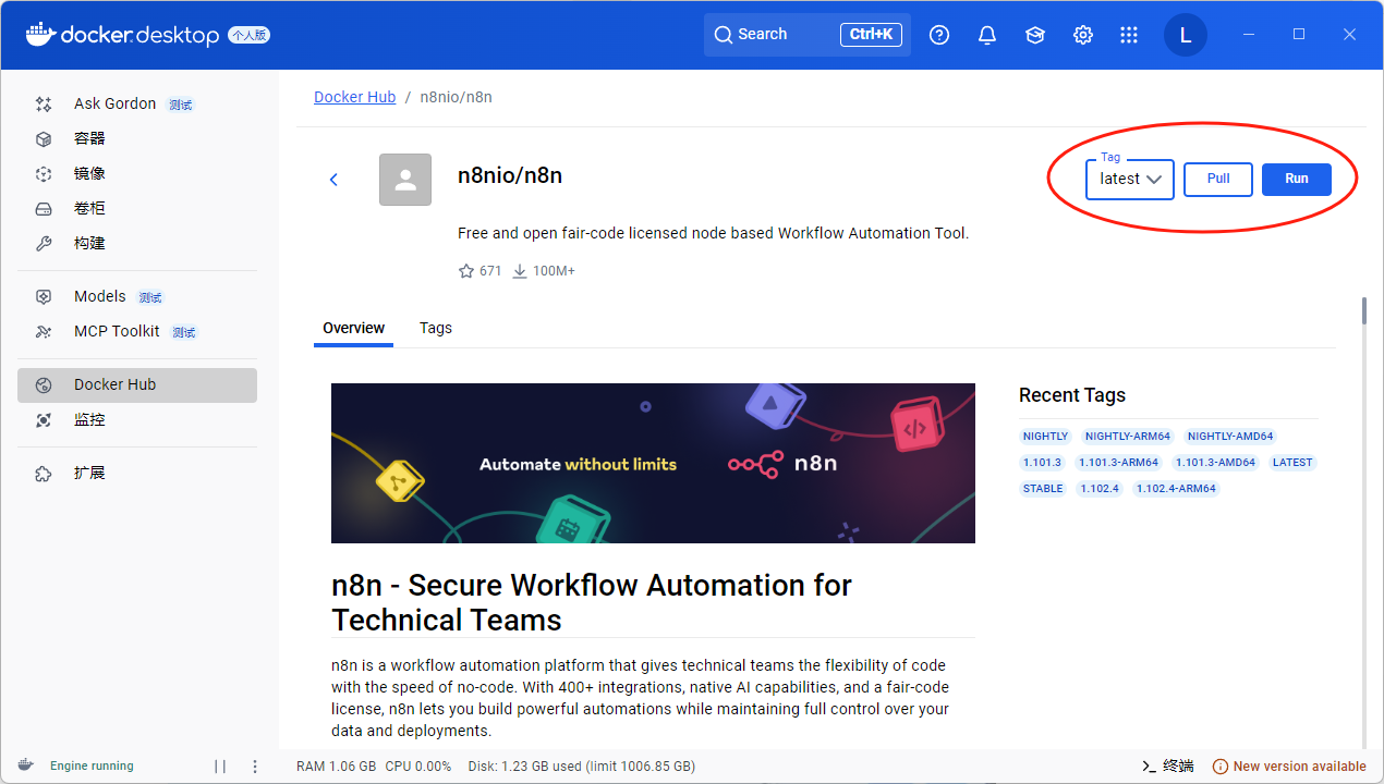 2.选择 n8nio/n8n 这个官方镜像,点击右边的 Pull,下载该镜像。