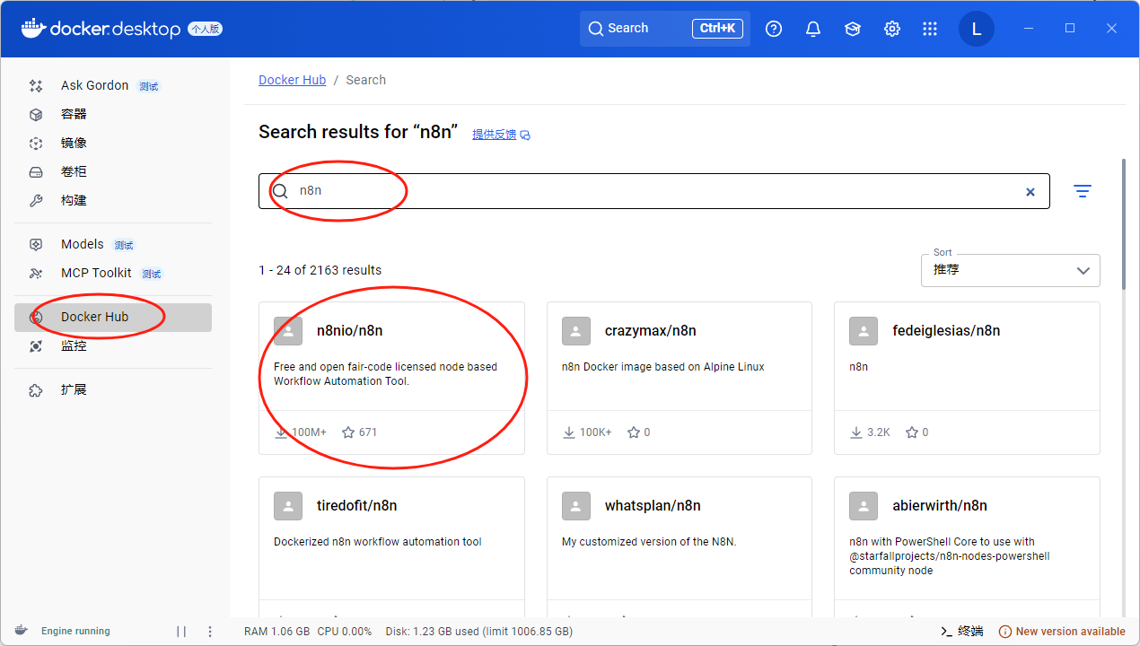 1.在 Docker Hub 中点击搜索框,输入 n8n。