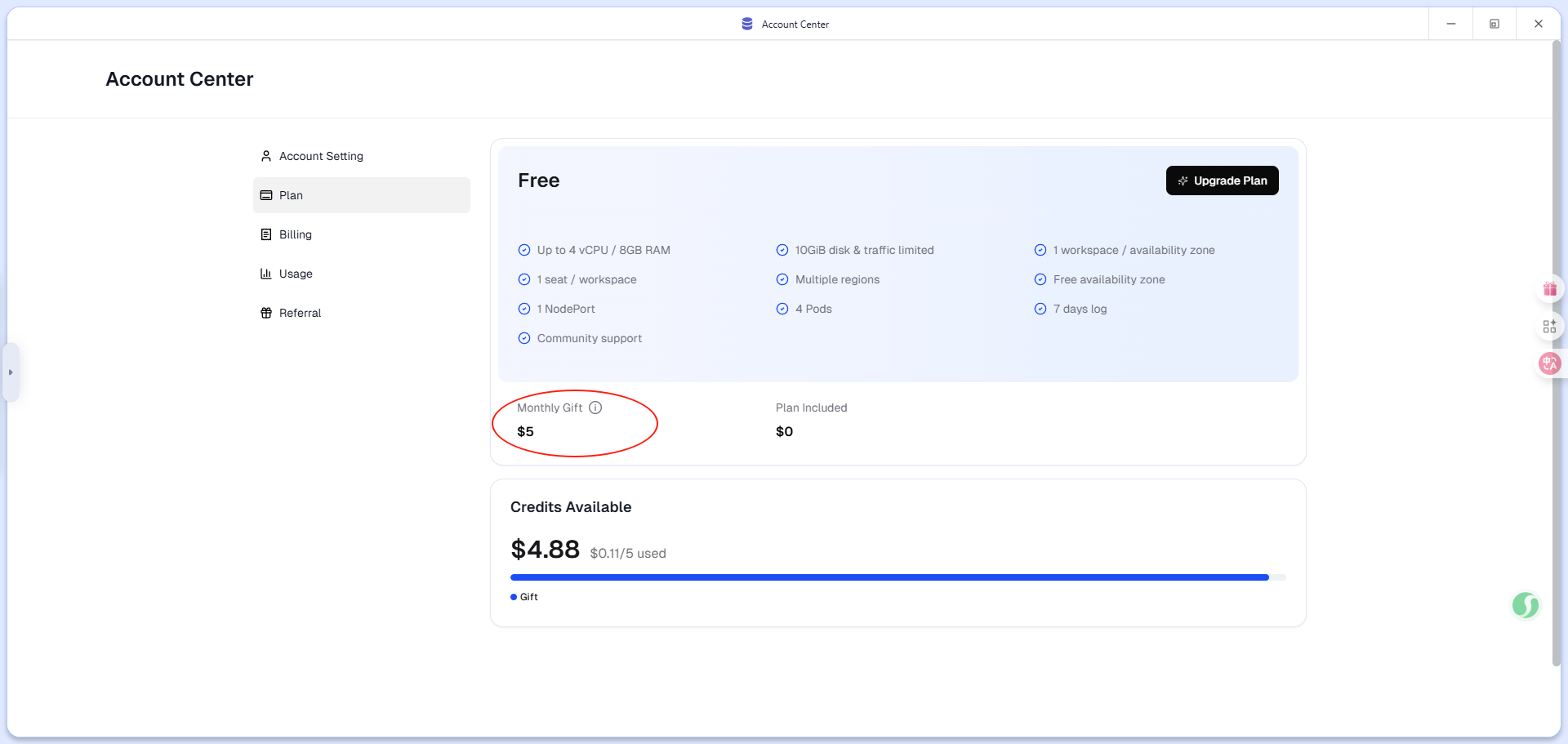 第三步:检查每月赠送情况,默认5美金